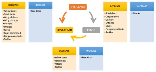Table 2 shows the descriptive (mean and standard deviation) and inferential results of the influence of COVID on the different PIs. Significant differences were found in eight PIs of the pre-COVID and COVID seasons, with increasing attacks and decreasing total and on-goal shots, corners, offsides, saves, dangerous attacks and tackles. From the COVID season to the post-COVID season the different variables became more stabilized and significant differences were only found in five of them, with increasing free kicks and decreasing yellow cards, total shots, attacks, and tackles. The greatest change was shown in the pre-COVID/post-COVID comparison, with significant differences in eleven variables: increases in free kicks and decreases in yellow cards, total, on- and off-goal shots, corners, offsides, saves and fouls committed, dangerous attacks and tackles.