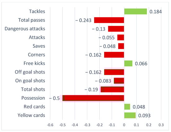 Figure 2 presents the significant differences existing in the performance indicators over the different seasons. Yellow and red cards, total, on-goal and off-goal shots, free kicks, corners, saves, attacks, dangerous attacks, total passes and tackles have a low autocorrelation, while possession has a high autocorrelation [26]. The means for yellow and red cards, free kicks and tackles increase as the seasons advance, as they have a positive autocorrelation; while in contrast, possession, total, on-goal and off-goal shots, corners, saves, attacks, dangerous attacks, and total passes have a negative autocorrelation, which indicates that their means decrease over the seasons.