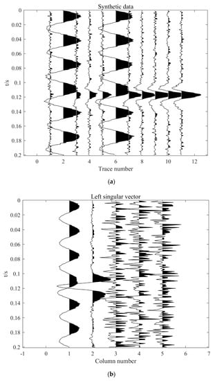 However, the seismic signal becomes significantly disturbed by intense noise. Figure 1a shows intense amplitude noise in the 2nd and 6th seismic data. The seismic data are decomposed by SVD, as shown in Figure 1b. The first LSV represents noise, and the second represents the effective signal. The traditional singular value method cannot denoise seismic data in this case. In Figure 1c, the first RSV correspondingly represents the amplitude change of seismic data, in which sizeable abrupt change represents intense amplitude noise. By contrast, the absolute value of the second RSV generally shows an increasing trend, which confirms that seismic signal amplitude gradually increases.