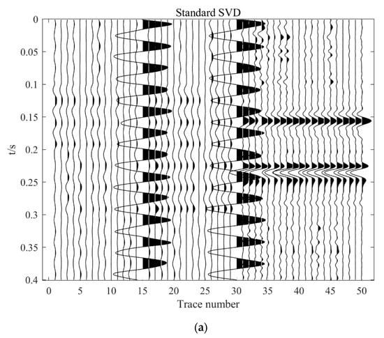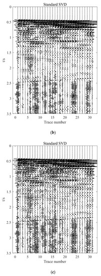 Only the first singular value (K = 1) was used to reconstruct the seismic data. The results are shown in Figure 8a, where the random noise is removed to a large extent. However, the seismic signal is lost on a large scale due to the interference of intense amplitude noise, which is not removed. The conventional SVD filtering results are shown in Figure 8b; the seismic signals are all preserved when K = 2, but it cannot effectively remove the intense amplitude noise. Since the SVD filter does not have low-pass filtering capabilities, the effective frequency band of the synthetic seismic data was between 0 and 100 Hz, and the synthetic seismic data were processed using low-pass filtering (0–100 Hz). The results in the later sections were also after adding low-pass filtering.