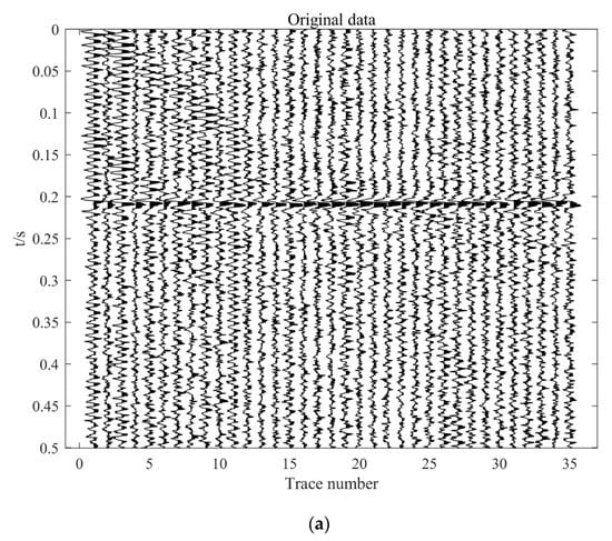 The synthetic 2D seismic data containing 50 traces and 400 sampling points are presented in Figure 7a. Gaussian noise with SNR = −4 was added to the synthetic seismic data, and intense amplitude noise was added to the seismic data of the 15th and 30th channels. The noise negatively impacted the seismic signal, where part of the seismic signal was completely drowned in the noise (see Figure 7b). To denoise the synthetic seismic signal, the seismic data were first reconstructed using the conventional SVD filtering (K = 1 and K = 2). When singular value decomposition filtering was performed to denoise seismic data, K = 1 and K = 2 were the most common because the seismic signal was mainly concentrated on the maximum singular value. Conventional singular value decomposition filtering uses window parameters of n = 15 channels and m = 100 sampling points.