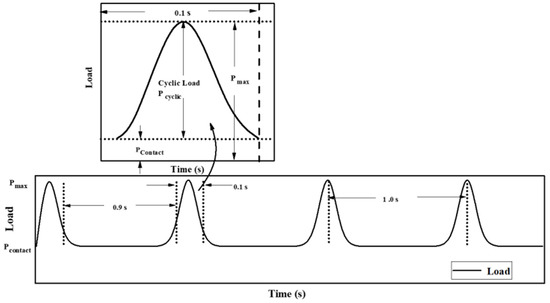 By employing this test, a non-destructive test, to calculate the stress-strain asphalt specimens’ behavior, the elastic properties of the mixture can be determined. The findings of the Mr test provide a fundamental constitutive relationship between the stiffness and stress condition of the pavement material, which may be used in the multilayer pavement systems structural analysis and the methodologies of pavement design. Based on the ASTM D7369-20 [37] specification, the resilient modulus test is applied for both the WMA mixture and the HMA mixture. The samples were tested at the following temperatures: 20, 25, 30, and 40 °C. Using a Marshall compactor, a cylindrical specimen of 100 mm in diameter and 63.5 mm in height was created. The specimen should be conditioned to the test temperature before testing and placed in a temperature chamber. A temperature chamber that is included with the test apparatus is used to condition specimens before testing. Repeated load is applied to the conditioned cylindrical sample, which has a haversine shape, as presented in Figure 2. The applied load, as shown in the figure, had a 1 Hz frequency and was applied for 0.1 s of load time and 0.9 s of a rest period.