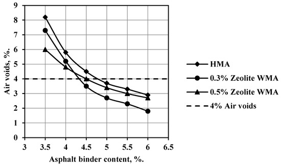 Figure 3 demonstrates that the optimum amount of the asphalt binder content for HMA and WAM with 0.3% and 0.5% zeolite is 4.7%, 4.3%, and 4.5%, respectively. The WMA that contains 0.3% zeolite has the lowest value of asphalt binder content.