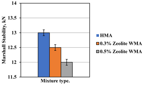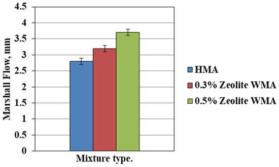Figure 5 presents the Marshall flow, and the required range of the flow is (2–4) mm according to Iraqi specifications [13]. As presented in the figure, the flow values for all mix types are within the required range of the flow and are considered satisfactory. The figure shows that the HMA has the lowest Marshall Flow value, and the increase in zeolite additive concentration increases the flow values. The result complies with Vaitkus et al. [39]. Error bars demonstrate the validity of the data, and as there are no overlaps between the bars, the WMA and HMA flow mixtures differ significantly from one another.