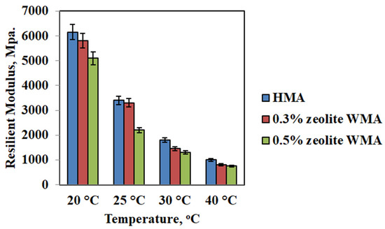 Figure 6 displays the findings of the resilient modulus values for the 12 prepared cylindrical specimens, which are tested at four test temperatures (20, 25, 30, and 40) °C subjected to a haversine waveform of 1 Hz frequency which has 0.1 s loading duration and 0.9 s rest period. As seen in the figure, a temperature rise has a considerable impact on the resilient modulus. The findings show that the WMA mixtures of two percentages of zeolite have the lowest value of resilient modulus, whereas the HMA mixture has a greater value of the resilient modulus which means that the WMA mixture is affected greatly by the temperature increase like the HMA mixture. The WMA mixture that has 0.3% zeolite shows a higher value of the resilient modulus than the 0.5% zeolite specimen. Despite this result, the WMA shows a good resilient modulus that can compete with the HMA. The aggregate skeleton of the compacted specimen may be a reason for this result. The HMA specimen compacted at a higher compaction temperature than the WMA specimens. Given that loads can be transferred from one aggregate to another more successfully with a more durable aggregate skeleton or aggregate-aggregate connection, the foaming effect of zeolite addition results in a low increase in the asphalt binder volume, which enables sufficient coating of the surface of aggregate during the mixing process at a lower temperature and may raise the modulus of the asphalt mixture. The higher resilient modulus leads to thinner asphalt layers in the first phase of the design, which produces a more economical pavement design. This result complies with Vaiana [40].