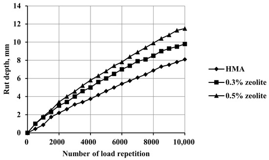 The HMA mixtures show a better rutting resistance than the WMA of two percentages of zeolite because the rut depth is lower than the WMA samples. Despite this result, the WMA shows good resistance to rutting that competes with the HMA. Although the mixing and compaction temperatures of the WMA samples are lower than those of the HMA sample, the addition of zeolite has enhanced the mixture’s compactibility and workability and reduced the air voids contents. Additionally, the asphalt binder volume slightly increases when the zeolite is added, which enables proper coating of the surface of the aggregate at a lower temperature when mixing. For all these reasons, the WMA appears to be competing with HMA. This result complies with Xie et al. [41], Wen [42], Piccone, et al. [43], and Asmael [44].