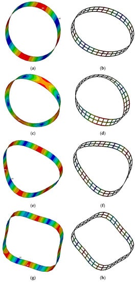 To obtain the initial values of the uncertain parameters X1 to X6, a representative local drum section of the Peng-cheng tower at the height of around 130 m is simulated using detailed shell elements first, and its 1st~5th order dynamic characteristics are calculated accordingly (see Figure 10a,c,e,g,i). Second, a corresponding preliminary beam-net model is established using a beam element with uncertain parameters , and (see Appendix A for their definitions). Third, regarding the 1st~5th order dynamic characteristics calculated using the shell element model as the optimization targets, dynamic model updating is attempted on the beam element model by identifying the correct values of , and , and they are identified as 0.448 × 10−2 m, 0.493 × 10−3 m and 0.579 × 10−2 m, respectively. The 1st~5th order dynamic characteristics calculated using the updated beam element model are presented in Figure 10b,d,f,h,j. Fourth, (see Appendix A for their definitions) are calculated as being 5.06 MPa.m4 and 0.273 GPa.m2, respectively, for the representative local drum section. Fifth, using Equation (A1), the initial values of the uncertain parameters X1 to X6 are estimated for use as being 0.697 × 10−3, 0.349 × 10−2, 0.768 × 10−4, 0.384 × 10−3, 0.901 × 10−3 and 0.450 × 10−2, respectively.