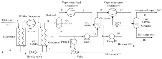 The conventional methods of producing steam generally include direct electrical heating, gas-fired boilers, and heat pumps. Compared with the other two methods, heat pumps have the lowest power consumption [5]. At present, the heat pump with temperatures below 100 °C has replaced the traditional direct electrical heating method and has gradually been applied in many areas. A heat pump with a temperature between 100–140 °C is in the development stage, and many researchers focus on its performance improvements [7,8]. Jiang et al. [9] studied a NH3/vapor heat pump system applied in a poultry slaughtering plant with a temperature range of −40 °C to 125 °C, and the results showed that, although the initial investment of an integrated system is larger, the energy saving effect is remarkable. Bamigbetan et al. [10] experimentally studied a compressor in a cascade heat pump system for industrial waste heat recovery from 50 °C to heat delivery at 115 °C, and the efficiency of the compressor was up to 74%. However, heat pumps with temperatures above 140 °C have received less attention. Kobe Steel proposed a system to supply the water vapor with a temperature of 160 °C in theory but did not present further study on this system [11,12]. Hosmadakis et al. [13] investigated a two-stage heat pump cycle with heat at a temperature of up to 150 °C from heat with a temperature of 40 °C, and the simulated COP is only about 1.6. The major factors limiting the development of heat pumps with high temperatures are the lack of suitable refrigerants and the low operation stability of the compressor caused by the lubricating oil deterioration under the discharge temperature above 150 °C. To solve these problems, a water vapor compression heat pump system is proposed to replace the conventional high-temperature heat pump while the required temperature is relatively high. Chamoun et al. [14,15,16] proposed a high-temperature heat pump using water as a working fluid to recover waste heat with temperatures between 80 and 90 °C to provide a heat source with temperatures between 120 and 130 °C, and the experimental COP was up to 4.5. Moreover, the use of a water vapor compressor is also a suitable method to directly increase the temperature and pressure of water vapor [17,18,19,20], and this method has been widely used in mechanical vapor compression/recompression desalination technologies [19,21,22]. Additionally, water injection is an effective method to improve the performance of the compressor [20,23]. However, while the suction temperature of water vapor is below 50 °C, the suction pressure is much lower than the atmospheric pressure, which will lead to a large leakage loss in the vapor compressor. Additionally, it is difficult to compress water vapor by vapor compressor directly and efficiently. Thus, the combination of a heat pump and water vapor compression system seems to be a good way to achieve waste heat recovery and high-temperature vapor supply when the heat pump is used to raise the temperature of water/vapor to about 90 °C and the vapor compressor is used to raise the temperature of vapor above 150 °C.