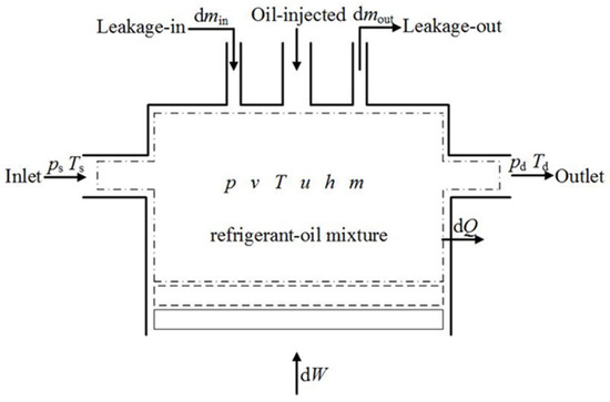In this work, a twin-screw compressor is applied in the heat pump. To improve the calculation accuracy, the efficiency of the compressor applied in the heat pump is calculated under different working conditions. A thermodynamic model based on the first law of thermodynamics and mass conservation is established to obtain the isentropic efficiency. The following assumptions are made to simplify the calculation process [29,30]: