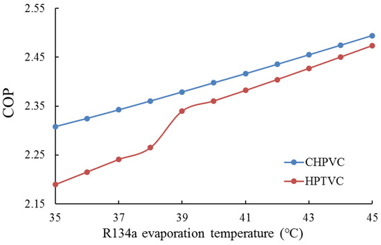Figure 4 shows the COP variation versus the R134a evaporation temperature, which is from 35 °C to 45 °C, and the other operating parameters are shown in Figure 1 and Figure 2. Meanwhile, the inlet water temperature is 40 °C to 50 °C. With the increment of the R134a evaporation temperature, the temperature difference between the R134a evaporation temperature and the required vapor temperature decreases, which leads to the increment of the COP. Moreover, CHPVC has a higher COP, and with the increment of the R134a evaporation temperature, the COP difference between the two systems decreases. The maximum COP difference is 5.13% at the R134a evaporation temperature of 35 °C, and the minimum COP difference is 0.82% at the R134a evaporation temperature of 45 °C. The comparison results mean that while the temperature of the heat source is relatively low, CHPVC is a better system to raise the water vapor temperature. In addition, for HPTVC, a significant rise in the COP occurs at the R134a evaporation temperature between 38 °C and 39 °C. The major reason is that while the compression process changes from under-compression to over-compression, the simulated isentropic efficiency is significantly improved, which is similar to the results shown in Zhang’s work.