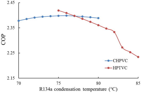 For CHPVC, the COP increases first and then decreases with the increment of the R134a condensation temperature. The optimal COP is 2.398 at the R134a condensation temperature of 76 °C. However, for HPTVC, the COP decreases continuously with the increase in the R134a condensation temperature. The major reason is that the temperature lift driven by the vapor centrifugal compressor decreases. Moreover, a significant drop occurs at the R134a condensation temperature between 82 °C and 83 °C. The major reason is that the simulated isentropic efficiency decreases dramatically, while the compression process changes from under-compression to over-compression due to the increment of the pressure ratio of the R134a compressor. The optimal COP is 2.419 at the R134a condensation temperature of 75 °C. Meanwhile, the suction pressure and the pressure ratio of the vapor centrifugal compressor are 0.025 MPa and 2.8, respectively. Additionally, while the R134a condensation temperature exceeds 78 °C, CHPVC has a higher COP, and the reverse is true for the R134a condensation temperature below 77 °C. It can be deduced from the simulation results that for CHPVC, a suitable temperature lift of the cascade heat pump is important, and for HPTVC, a large temperature lift driven by the centrifugal vapor compressor is relatively good as its pressure ratio is allowed.