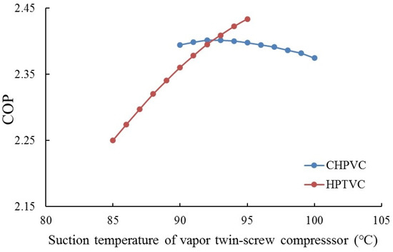 Figure 6 shows the variation of the COP versus the suction temperature of the vapor twin-screw compressor, and the other operating parameters are shown in Figure 1 and Figure 2. Similarly, the pressure ratio of the vapor centrifugal compressor cannot exceed 3. Hence, the suction temperature of the vapor twin-screw compressor is from 85 °C to 95 °C for HPTVC. For CHPVC, the COP grows first and then drops with the increment of the suction temperature. The optimal COP is 2.402 at the suction temperature of 92 °C, and the pressure ratio of the vapor compressor is 6.29. However, for HPTVC, with the increment of the suction temperature, the COP increases dramatically. The major reason is that the difference between the two compressors’ pressure ratios decreases with the increment of the suction temperature. The maximum COP is 2.434 at the suction temperature of 95 °C. Meanwhile, the pressure ratio of the vapor centrifugal compressor is 2.71, and the pressure ratio of the vapor twin-screw compressor is 5.63. Moreover, while the suction temperature exceeds 93 °C, HPTVC has a better COP, and the reverse is true for suction temperatures below 92 °C. It can also be deduced that for HPTVC, a large temperature lift driven by the vapor centrifugal compressor is relatively good as its pressure ratio is allowed.
