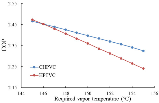 Figure 7 shows the variation of the COP versus the required vapor temperature, which is from 145 °C to 155 °C, and the other operating parameters are shown in Figure 1 and Figure 2. An increment in the required vapor temperature results in a decrement in the COP. The major reason is that both the pressure ratio and the power consumption of the vapor twin-screw compressor increase with the increment of the required vapor temperature. The maximum COPs of CHPVC and HPTVC shown in Figure 7 are 2.466 and 2.474, respectively, at the required vapor temperature of 145 °C. Moreover, while the required vapor temperature exceeds 146 °C, the COP of CHPVC is higher than that of HPTVC, which means that CHPVC is more suitable for the required vapor with high temperature and HPTVC is more suitable for a relatively small temperature lift.
