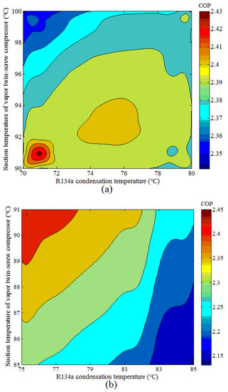 Figure 8 shows the COPs of the two systems versus the R134a condensation temperature and the suction temperature of the vapor twin-screw compressor at the inlet water temperature of 45 °C and the required vapor temperature of 150 °C. For CHPVC, it is obvious that both the R134a condensation temperature and the suction temperature of the vapor twin-screw compressor should not be too high, generally below 72 °C and 92 °C, respectively. This result means that the temperature lift provided by the cascade heat pump should not be too large, and the vapor twin-screw compressor should be used to provide a large saturation temperature rise. The optimal COP is 2.432 while the R134a condensation temperature is 71 °C, and the suction temperature of the vapor twin-screw compressor is 91 °C. For HPTVC, it is clear that the R134a condensation temperature should be relatively small, and the suction temperature of the vapor twin-screw compressor should be relatively large, which means that the pressure ratios of the R134a heat pump cycle should be relatively small, and the vapor centrifugal compressor should provide a large pressure rise as its pressure ratio allows. Moreover, the optimal COP of HPTVC is 2.436 while the R134a condensation temperature is 75 °C and the suction temperature of the vapor twin-screw compressor is 91 °C. Meanwhile, the pressure ratio of the vapor centrifugal compressor is 2.91.