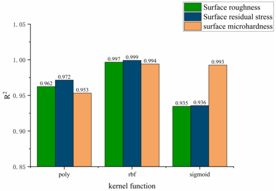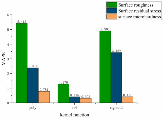 - To build the SVR model, three different kernel functions were utilized. The results demonstrated that the rbf kernel function had better performance in the prediction model of surface roughness, surface residual stress, and surface microhardness (surface roughness: R2 = 0.996671, MAPE = 1.276123, surface residual stress: R2 = 0.999188, MAPE = 0.415134, surface microhardness: R2 = 0.99411, MAPE = 0.301652).