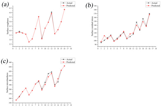 - Comparing the actual value and the predicted value, R2 was greater than 0.9, thus using the HPSO optimized SVR model could achieve high-performance prediction of surface roughness, surface residual stress, and surface microhardness.
