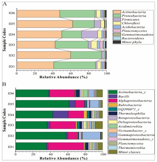 Microorganisms including bacteria and archaea that have potential for extensive bioremediation activities are frequently found in landfills and/or dump sites [,]. Bacterial taxonomic distributions in this study revealed that the most dominant phyla across the samples were Actinobacteria, Proteobacteria, and Firmicutes. Numerous studies have found that the phyla Proteobacteria, Firmicutes, and Bacteroidetes are prevalent in anaerobic ecosystems such as aquifer sediment [], river sediment [], and wastewater bioreactor [] as well as landfills []. Furthermore, some studies have indicated the dominant presence of Firmicutes, Proteobacteria, and Bacteroidetes in various maturing landfills [,,,]; however, in the present study, we identified phylum Actinobacteria as the most dominant from the collected dump site soils, with the exception of ID1 (Figure 1A). This could indicate that most informal dump sites are not mature enough to have Proteobacteria or Firmicutes dominate over Actinobacteria. In addition, the breakdown of organic matter, which is a part of carbon turnover, is the primary activity of Actinobacteria [,]. Because dump sites receive waste from a wide range of sources, the amount of organic matter in the soil could be a factor in their presence in informal dumping soil. Not surprisingly, Actinobacteria are also important in the recycling of refractory biomaterials by decomposing complex polymer mixtures in dead plants and animals as well as fungal materials []. Next to Actinomycetes, the phylum Proteobacteria was the most abundant in all samples, suggesting that Proteobacteria may play a pivotal role in the degradation and assimilation of both organic and inorganic substances respectively, including heavy metal contaminants in dump site soil []. Dump site soils also harbored Chloroflexi, Acidobacteria, Planctomycetes, Bacteroidetes, and Gemmatimonadetes, among other bacterial phyla. Chloroflexi bacterial members are assumed to play a major role in the environment by fermenting carbohydrates and degrading other complex polymeric organic compounds to low molecular weight substrates, which are used by other bacteria for growth []. Bacteroidetes are gaining attention for use in bioconversion industries along with Actinobacteria, Firmicutes, and Proteobacteria because they grow quickly on laboratory media and biodegrade biomass efficiently []. Phylum Gemmatimonadetes only has one described member, Gemmatimonas aurantiacus, a Gram-negative aerobic heterotroph isolated from sewage []. Previous studies have found the highest relative abundance of Gemmatimonadetes near neutral pH [,], which is consistent with our findings. Nonetheless, there is still much to understand about the diversity of this group.
