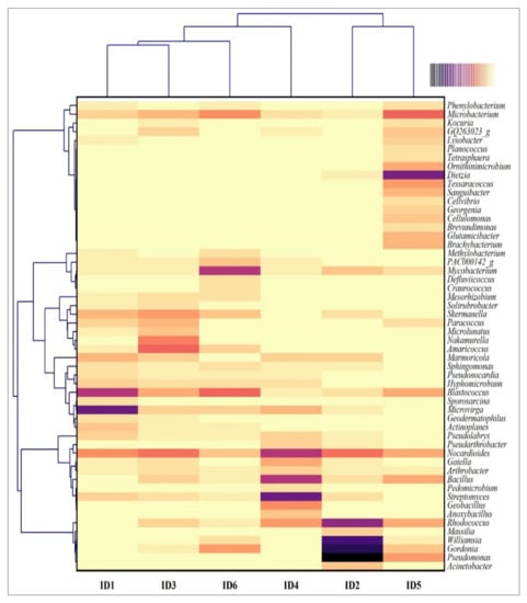 The genus level analysis revealed that each sample had a distinct dominant genus. For example, the Alphaproteobacteria genus Microvirga, found predominately in soil sample ID1, has the ability to oxidize arsenite []. Similarly, the genus Actinoplanes is native to a wide range of habitats and is thought to play a role in the turnover of chitin, cellulose, and lignin []. Other genus including Skermanella and Marmoricola from sample ID1 have demonstrated high resistance to heavy metals [], but their biotechnological potential remains elusive. It was not surprising that Pseudomonas dominated the sample collected from the automobile dumps (ID2), which is consistent with other studies [,]. It is reasonable to hypothesize that the Pseudomonas sp. from these locations could be an essential component in the bioremediation of environmental settings that have been contaminated by oil and grease. Rhodococcus and Nocardioides were the most common genera in the ID2 sample, followed by Gordonia. All of these members are phylogenetically close relatives, and their ability to degrade environmental pollutants has recently attracted greater interest from the biotechnology industry []. The soil sample from the train station dump site (ID3) was dominated by Amaricoccus, which had previously been detected in the activated sludge system [] and was found to contribute to sulfamethoxazole biodegradation. Recent research has also shown that they are the primary degrader of Triclosan (5-Chloro-2-(2,4-dichlorophenoxy) phenol, TCS), an active component found in many common personal care products such as soaps, shampoos, and toothpastes []. Other dominant members of the respective samples, ID4, ID5, and ID6 were also reported in various landfill soils [,,,,], demonstrating its important ecological function. Intriguingly, Nocardioides (Figure 2), a significant genus in Actinomycetes, was present in all samples used in this study. This genus was previously reported to be the dominant member of Dominican amber and Israeli amber preserved at about 120 million years ago []. This genus has the potential to withstand the exposure to toxic heavy metals and is involved in the breakdown of hexachlorobenzene (HCB) and pentachlorophenol (PCP) []. Findings from this study suggest the idea that this potentially contributes to biodegradation and thus could be an important bioinoculant for landfill pollutant sequestration.