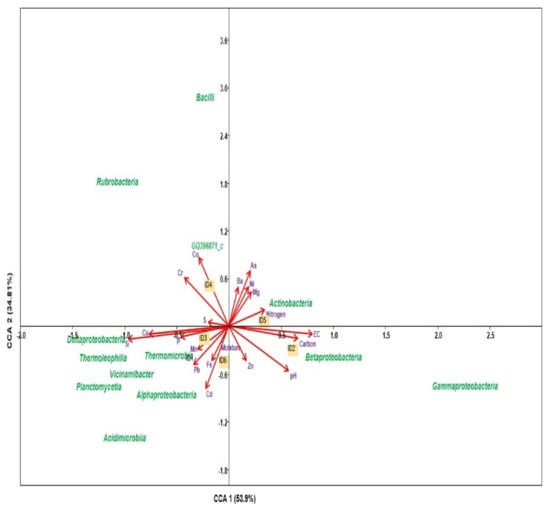 The relationship between the bacterial communities and the environmental factors at informal dumping sites (ID2–ID6) along with ID1 (litter free zone) is depicted in Figure 3. The CCA triplot analysis showed that the abundance of Betaproteobacteria and Gammaproteobacteria (phylum Proteobacteria) was positively correlated with high TC and pH (p < 0.05). Alphaproteobacteria, another Proteobacterial class, were correlated with high Fe, Pb, and Cd concentrations. In contrast, the distribution of members of class Actinobacteria correlated highly with TN, while the distribution of members of the class Thermomicrobia and Vicinamibacter correlated to the high contents of Mn and Pb, respectively (p < 0.05) (Figure 3). Negative correlations between the distribution of Betaproteobacteria and Gammaproteobacteria and Cu, Mn, Pb, Fe, and total phosphorus contents were also detected (p < 0.05). Similarly, Actinobacteria exhibited a negative correlation with S and Cr concentration, while Acidimicrobiia had a negative correlation with As concentration.