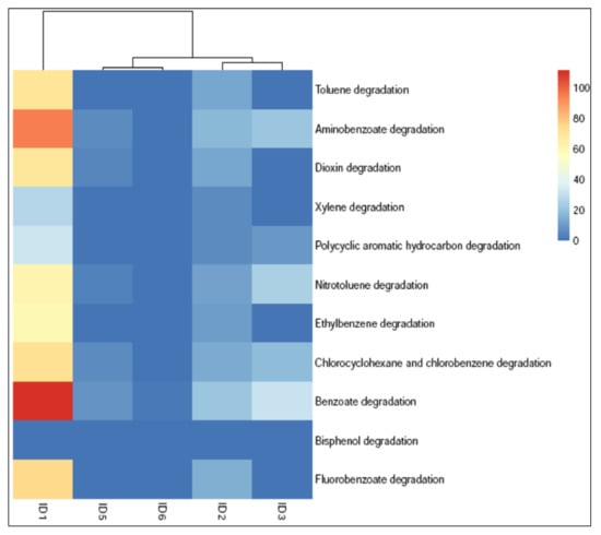 The study also performed PICRUSt profiling to complement the phylogenetic insights for the prediction of functional potentials associated with the dump site soil microbial community. Results revealed the existence of putative biosynthetic and degradative pathways across all six of the sample locations (Figure 4). The lipid biosynthesis genes, amino acid biosynthesis genes, and terpenoid biosynthesis genes were found in relatively higher abundance. Furthermore, genes responsible for xenobiotic aromatic compounds such as dioxin, xylene, toluene, aminobenzoate, nitrotoluene, ethyl benzene, bisphenol, cyclohexane, benzoate, flourobenzoate, and polyaromatic degradation genes were enriched in the dump site samples (Figure 4). It should also be noted that other pathways of interest such as bacterial chemotaxis, bacterial motility, carbon fixation, electron transfer, germination, lipid metabolism, methane metabolism, plant–pathogen interactions, protein exports and kinases, secretion systems, signal transduction, sporulation, and transcription machineries were also abundant (data not shown in the figure).