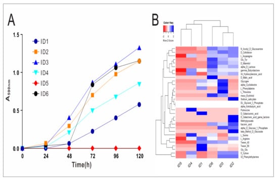 The Biolog EcoplatesTM were used to assess the catabolic diversity of the bacterial communities in the samples obtained. Three grams of the different soil samples were suspended in 27 mL of sterile 0.85% sodium chloride solution and vortexed for 5 min at maximum speed. After settling for 10 min, 180 μL of the supernatant was inoculated into each of the wells. All plates were sealed with parafilm on the sides and incubated at 25 °C in the dark. A VarioSkan Flash Multi Detection Microplate Reader (Thermo Fisher Scientific Inc, Waltham, MA, USA) was used to measure each well’s optical density (OD at 590 nm, OD590nm) at times 0, 24, 48, 72, 96, and 120 h. During the calculations, the OD were corrected by subtracting the blank well (inoculated, but without a carbon source) values from each plate well. The resultant data were used to generate growth curves that were adjusted according to the modified Gompertz equation [], and GraphPad PrismTM software version 8.2.1 (GraphPad Software Inc., San Diego, CA, USA) was used to determine the exponential phase as well as the corresponding incubation time and maximum absorbance. Statistical analysis of the OD values obtained at 48–120 h was carried out to determine the average well color development (AWCD), as previously described by Mendes et al. []. A heat map of the 31-carbon utilization patterns was generated using the heatmap.2 package in R (version 3.6.1).