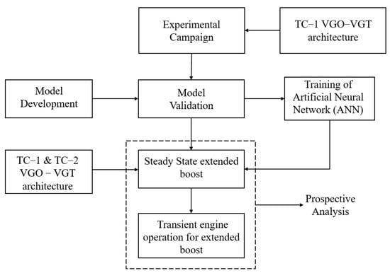 An extended boost pressure study in steady state and transient analysis was established, taking advantage of the robust model and understanding the potential benefits of using VGO architecture. These model assessments were conducted to avoid engine tests operating beyond the engine, turbocharger, or test bench’s safety limits, and to avoid any bias from changes in the scope of the experiments, such as environmental conditions.