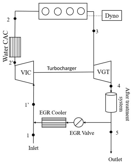 The engine used for this application is a new generation 4-cylinder, 2-L displacement, direct injection, and turbocharged compression ignition automotive application engine. This engine is already homologated and commercialized, and hence is already part of pollutant emissions legislation. However, in line with the idea of minimizing greenhouse gas emissions, the engine is being upgraded from several perspectives, as evidenced in this study, from the turbocharger point of view. Some of the main specifications of the engine are included in Table 1. INCA software from ETAS company controls the engine actuators, such as injectors and VGT. Figure 2 shows the schematic layout of the engine test setup. It comprises a water-charge air cooler (WCAC) in the inlet manifold. Although an exhaust gas recirculation (EGR) control is not included in this work, the engine contains a low-pressure exhaust gas recirculation loop. The information related to the sensors employed in this study is provided in Table 2.