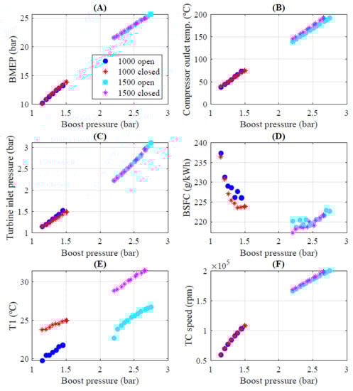 However, for 1500 RPM, a lower boost (hence, lower BMEP) was achieved in the closed configuration. The reason is that the compressor outlet temperature limit of 200 °C, shown in Figure 3B, was reached at a lower boost pressure level. This could be attributed to the unequal ambient temperature. The results of the temperature differences or compressor efficiency (or a combination of both) can be seen in Figure 3E. However, the turbine inlet pressure differences were negligible, as well as BSFC figures. Also, TC speed differences did not show any discrepancy. This shows that no change in the turbine-compressor matching emerged because of the VGO operation (at least for the mass flow range analyzed). In any case, the conclusions may be biased by dispersions arising during the experiments and reducing testing productivity. This is the primary motivation for developing an engine model to overcome this problem.