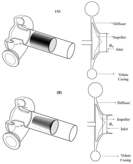 TC−1 operates with the compressor orifices as fully open or fully closed. The switching between the positions is carried out manually, and a dedicated actuator is used for locking the part. A schematic layout of the VGO technology is depicted in Figure 4. Figure 4A shows the VGO architecture in an open configuration, while Figure 4B shows VGO technology in the closed position. As Figure 4 shows, the minimum diameter at the compressor inlet () was restricted in the closed configuration ( > ). Following the procedure explained in [27], the compressor maps in the respective configuration were obtained. The resulting maps for TC−1 under open and closed configurations are included in Figure 5, as well as the speed and efficiency maps. Furthermore, Figure 5 includes, in black dotted format, the experimental information constituting the compressor map for the closed configuration. The closed VGO map has also been translated into the open map plots to show the impact of this mechanism on the open configuration (the default one). The information outside of the dotted area in the closed configuration corresponds to extrapolated information.