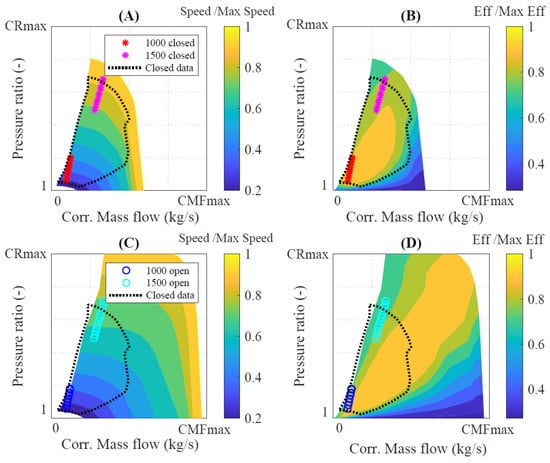 TC−1 compressor maps: (A,B) for closed configuration and (C,D) for open configuration.