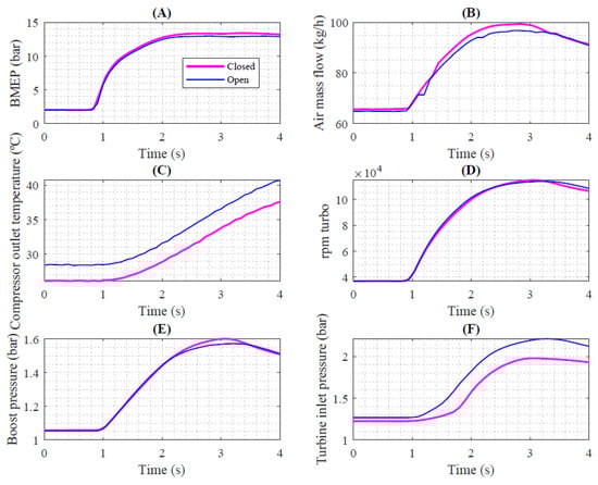 1000 RPM experimental results at transient operation for open and closed VGO configurations in TC−1: BMEP (A), Air mass flow (B), Compressor outlet temperature (C), Turbocharger speed (D), Boost pressure (E), and Turbine inlet pressure (F).