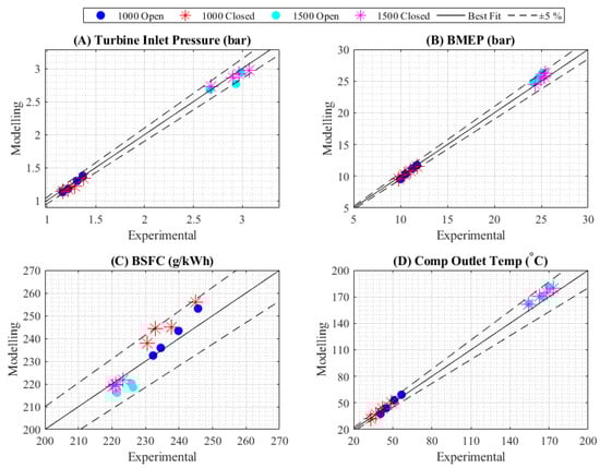 The 1D model used for this investigation was validated using the previously explained experimental data. For the validation, information related to exhaust manifold pressure, BMEP, BSFC, and compressor outlet temperature are shown in Figure 8. The X-axis refers experimental data, while the Y-axis shows the modeling predictions. Figure 8 includes a ±5% error in the dotted line (a continuous black line corresponds to the perfect agreement). This model validation was carried out for TC−1, taking advantage of the working points in Figure 3.