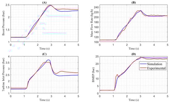 Simulation data compared to testing during sudden transient demand at 1500 RPM: Boost pressure (A), Air mass flow rate (B), Turbine inlet pressure (C), and BMEP (D).