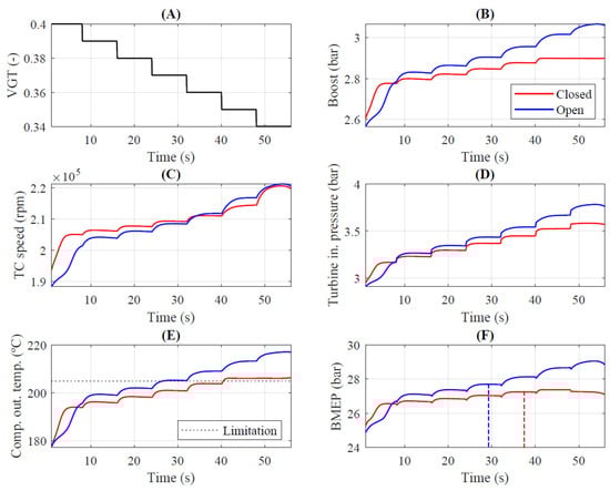 VGT management for extended boost study and resulting boost pressure. Cases dealing with TC−1, 1500 RPM, closed and open configuration: VGT actuator (A), Boost pressure (B), Turbocharger Speed (C), Turbine inlet pressure (D), Compressor outlet temperature (E), and BMEP (F).