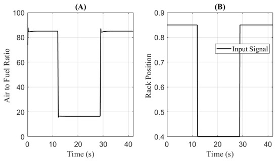 Initial conditions for transient engine response: Air to Fuel Ratio (A), and Rack Position (B).