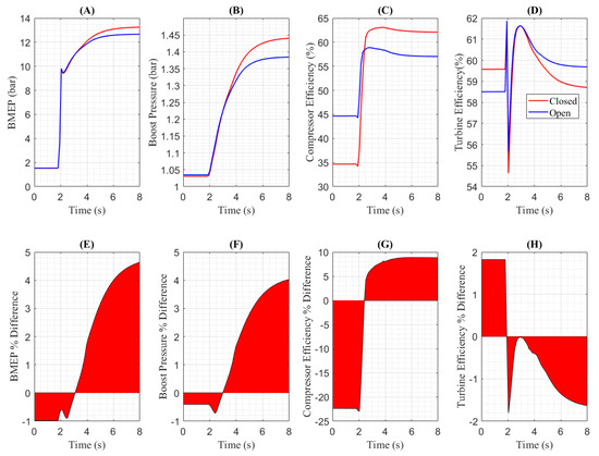 At 1000 RPM, plotted in Figure 12, as soon as the transient starts, an improvement in BMEP becomes evident, reaching a peak value of 4.6%. BMEP differences originating in boost differences, as Figure 12B shows in absolute terms, and Figure 12F in a percentage. As the boost pressure increases, so does the intake air charge. As both simulated series are assessed under the same AFR evolution, more fuel is injected, leading to the enhanced engine BMEP performance in the VGO closed configuration. This is purely attributed to the differences in the compressor maps depending on the setup. In the closed VGO in particular, the compressor operates at a more efficient region in the map, thus leading to a compressor efficiency improvement of 8% in VGO closed configuration over VGO open architecture, as shown in Figure 12C,F. However, Figure 12H shows that the closed configuration leads to some decline in the turbine efficiency (oscillating between 0% and −1.6%). Overall, considering the compressor and turbine performance benefits and drawbacks, there is an improved global performance in engine response.