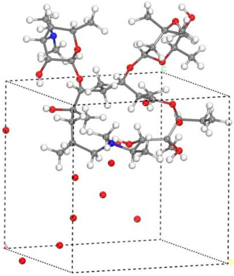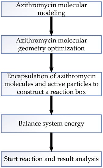 Figure 4 shows a periodic boundary reaction box containing ten oxygen atoms and one azithromycin molecule which can be infinitely extended in all three dimensions. The subsequent modeling of different numbers and types of ROS active particles is the same as above. By setting the periodic boundary, we can observe the changes in the whole system from a reaction box. During the reaction, some molecules run out of the reaction box from one side, but they will return to the reaction box from the other side, which will not affect the reaction result.