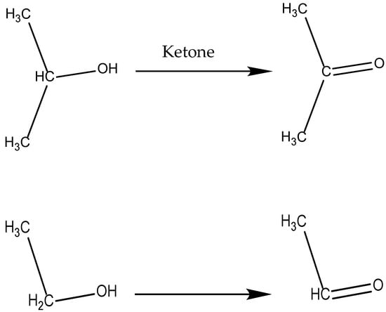Due to the participation of active-oxygen groups, many oxidation reactions occurred, and now the common oxidation reactions in the simulation are listed. The functional group (-OH) shown in the molecular structure in Figure 6 is called the alcohol group. An oxidation reaction can make the alcohol group form a ketone or aldehyde group if a hydrogen atom is on the attached carbon.