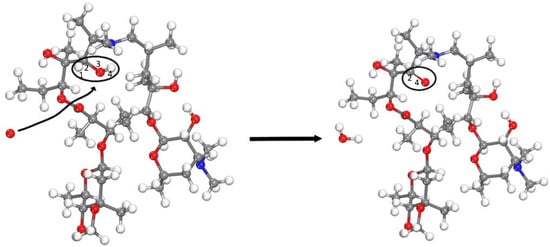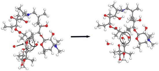 As shown in the molecular structure of azithromycin in Figure 7, three alcohol groups can be oxidized. Figure 8 shows the process of the alcohol group being corrupted. Under the action of oxygen atoms, H1-C2 is broken, O3-H4 is broken, and the fractured hydrogen atoms and oxygen atom form a water molecule and simultaneously form a C2=O4 double bond.