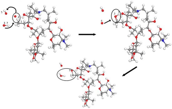 As shown in Figure 10, azithromycin is composed of three-ring structures, ether bonds connect the rings, and the three rounds are not in the same plane. Figure 10 shows the bond length of each chemical bond of the azithromycin molecule. It can be seen from the chemical principle that the shorter the bond length of the covalent bond, the greater the bond energy and the more stable the bond structure. As shown in Figure 10, some C-C bonds and C-O bonds (ether bonds) have longer bond lengths and lower energy. Therefore, the ether bonds with lower bond energy are insufficient to support the ring structure in the interaction, being especially impacted by many active particles. The ether bond cleavage influenced by active-oxygen groups is also described in the literature [26]. As shown in Figure 11, influenced by the energetic particles, after breaking the C3-O5 bond, the C3-H4 and C1-H2 bonds are broken simultaneously, forming a C1=O5 double bond, and then the hydrogen atoms generated in this process and the free oxygen atoms form a water molecule. After C3-O5 is broken, carbon atoms containing lone electrons recombine with active particles to form C3=O double bonds.
