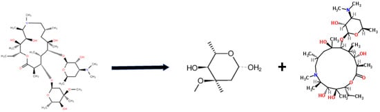 Azithromycin is a commonly used macrolide antibiotic which has a molecular formula of C38H72N3. As a representative of ester antibiotics, azithromycin is commonly used in aquaculture and animal feeding. The molecular structure is shown in Figure 1. The structure comprises three-ring systems, and the rings are connected by carbon–oxygen bonds (ether bonds). Its molecule has five alcohol groups, three of which can be oxidized into ketones, one ester group, and five ether bonds.