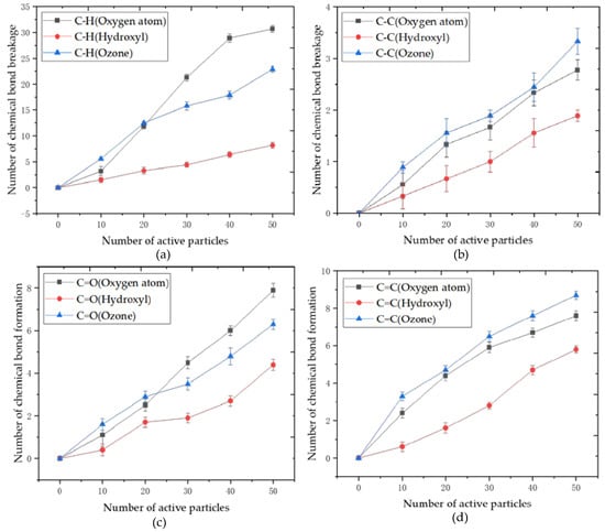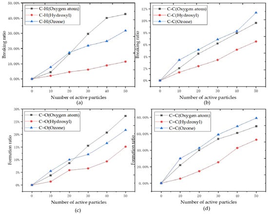 The data of the breaking and formation of main chemical bonds is listed in Table 1. The breakage of the C-H bond is almost throughout the entire reaction, and the oxidation reaction and the breaking of various chemical bonds firstly require a dehydrogenation reaction. It can be observed from Figure 14 that the dehydrogenation ability of ozone and reactive oxygen atoms is stronger, while the dehydrogenation ability of the hydroxyl group is weak. When ten active particles were added, the dehydrogenation capacity of ozone was the highest at about 7.08%. Ozone is unstable and can decompose more oxygen atoms to participate in the dehydrogenation reaction. Still, when 20 active particles or more are added, the dehydrogenation capacity of energetic oxygen atoms is the highest, reaching 38.61%. At the same time, the oxygen generated by the decomposition of ozone will react with hydroxyl groups to produce hydrogen peroxide or hydrogen superoxide instead of taking the hydrogen atoms on carbon atoms; that is to say, the products of ozone decomposition will react with the newly formed hydroxyl and other substances so that hydrogen atoms cannot be extracted from the carbon chain exclusively. Therefore, as the number increases, the hydrogen abstraction ability of oxygen atoms is stronger than that of ozone. Because the structure of the hydroxyl group is more stable than the oxygen atoms, its possibility of bonding with the hydrogen atom is not as urgent as oxygen atoms, and the C-H breaking rate is only 10.69%.