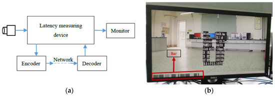 Figure 3a. The camera captures raw video and feeds it into the latency measurement device. The latency measurement device takes the arrival time of the synchronization pulse of the video frame as the input time of each frame. The frame input time and frame number are injected into the fixed position of the original video picture in the form of a barcode, and the video with the timecode is encoded, transmitted, and decoded to obtain a reconstructed video. The reconstructed video is also sent to the latency measurement device and the device records the arrival time of the synchronization pulse of the reconstructed video frame as the time when each frame of the reconstructed video reaches the display end. The barcode is read at the fixed position of the reconstructed video to obtain the frame number and frame input time and the arrival time and input time of the same frame are compared to obtain the end-to-end latency of each frame of the video transmission system.