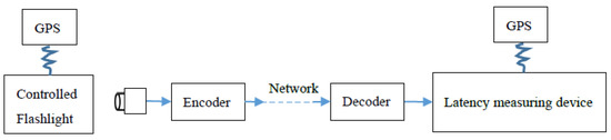 Figure 4. The solution includes a flashing light and a latency measurement device at the remote receiver. Time synchronization of remotely located measuring equipment uses GPS signals. The flashing light is controlled by the GPS PPS (pulse per second) to flash once per second, and the camera will send the captured pictures including the flashing light to the latency measurement device through the video transmission system. The device records the time when each frame enters the device and finds the frame when the flashlight just starts to light up. The fractional part of the time (in milliseconds) that the frame with the light on enters the device is the end-to-end latency of the video transmission.