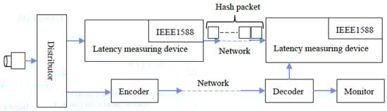 It is necessary to prepare one CC3030 at the transmitter and one at the receiver before measurement. Since it is impossible to ensure that both the transmitter and receiver of remote video transmission can receive GPS signals, the IEEE1588 protocol is used to realize time synchronization between the transmitter and receiver. In the measurement process, two transmission channels are carried out synchronously. One method is the transmission of the original video to obtain the reconstructed video. The other method is to process the original video and reconstruct the video. At the sending end, the original video is input to CC3030 and the hash code of the original video is obtained. At the receiver, the reconstructed video is input into CC3030 and the hash code of the reconstructed video is obtained. The original video hash code with time stamp is transmitted to the receiver CC3030 through the network, and the original video frame hash code matching the reconstructed video frame hash code is found. The video transmission latency is obtained by using the timestamp carried in their hash codes.