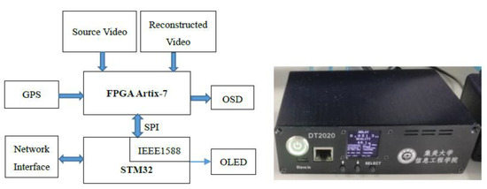 Figure 8, and the device is named CC3030. The device framework is mainly composed of heterogeneous systems based on Xilinx ARTIX-7 series FPGA and STM32F7 series MCU. Among them, FPGA is mainly responsible for image information processing and STM32 is mainly responsible for data processing and external interaction. The information processed by FPGA is transmitted to the STM32 microcontroller and the microcontroller calculates the latency. The device provides two HDSDI ports and two HDMI ports for video input and one HDSDI and one HDMI for OSD (On Screen Display) menu display. It can receive external GPS signals and the device’s configuration and measurement results can be seen on other devices’ web pages through the network port.