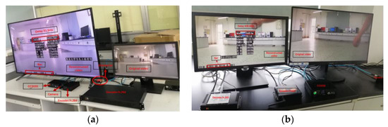 Figure 9a is the latency measurement process of video transmission through the H.264 codec. In the image, the right screen shows the original video, and the left screen shows the reconstructed video with the measurement results, and the time stamp is presented as a spline at the bottom of the screen. It can be seen that the real-time video acquisition format of the measurement process is 720P60HZ and the latency measurement result is 51.5 ms.