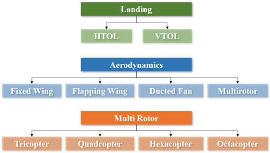 Classification of UAVs according to landing, aerodynamics, and multirotor [34].