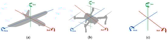 Other types of multicopter are hexacopters and octocopters: in the first case, the mechanism works with six motors where three work clockwise and three others move anticlockwise, while in the second case, power is provided by eight motors that transmit power to eight functional propellers. These latter configurations provide greater lifting power and stability than quadcopters, with the advantage of being able to land extremely safely [33]. A completely different category is fixed-wing UAVs, which are very similar in shape to an aeroplane and characterized by flight mechanics based on the lift of their wings. One of the advantages of this type of UAV is their longer flight times compared to multicopters, as well as their stability even in unfavourable wind conditions; in fact, they are mainly used in the field of land surveying and mapping, where flights can last up to an hour.