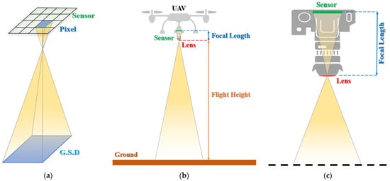GSD calculation: pixel size and its relation to the GSD (a), geometric acquisition (b), and detail of main elements of the camera (c).